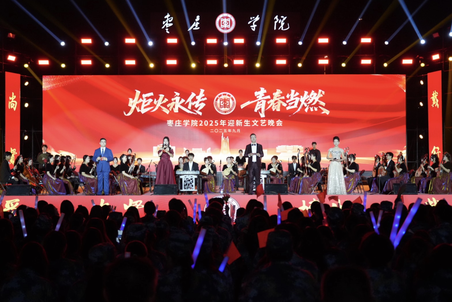 金秋枣院,梦想起航。9月27日、29日晚,“炬火永传 青春当燃”枣庄学院2025年迎新生文艺晚会分别在市中校区和薛城校区举行。校领导高峰、丛海林、丰雷、李目海、安涛、武尚民、褚夫敏、袁俊现、闫昕与各部门负责同志、各学院师生代表及2025级全体新生齐聚一堂,共同观赏这场融历史厚重与青春活力于一体的视听盛宴。晚会同步开通线上直播,近7万名师生及校友在“云端”共鉴。