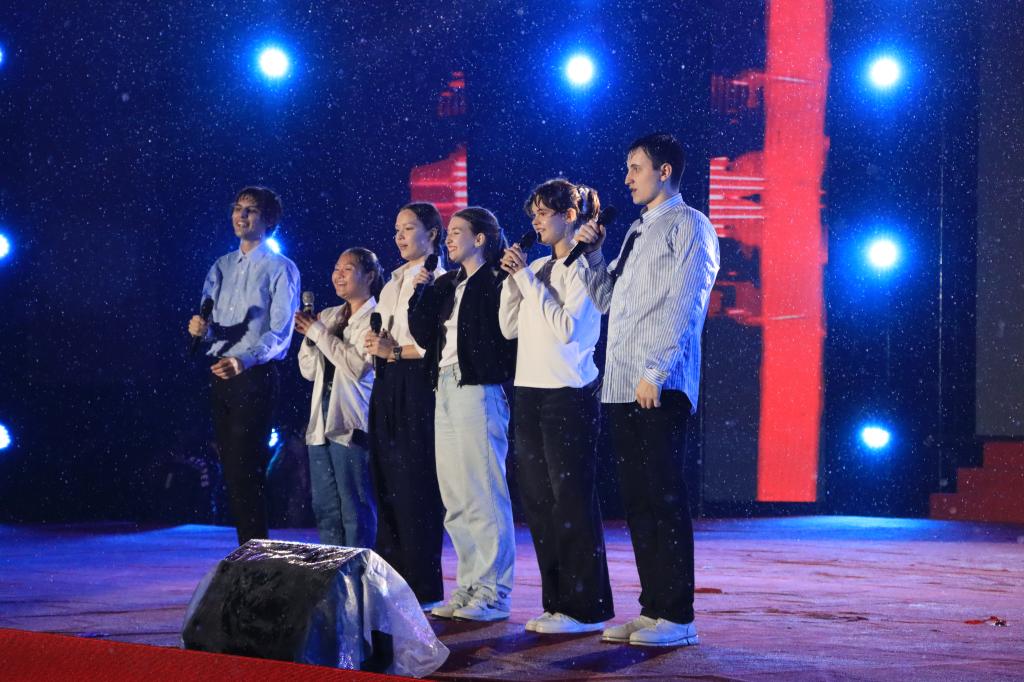 五湖四海乡音荟萃,一带一路友谊长存。新生节目《“乡”承星火,“枣”启新程》通过抗战时间线讲述家乡的抗战故事,《“语”你“乡”遇》则通过各地方言展示地域文化,一句句乡音寄托着对故土的深情和对未来的憧憬。来自俄罗斯、南苏丹、摩洛哥的留学生带来的歌曲串烧《环球律动》,展现了不同文化交融的魅力,将晚会气氛推向高潮。晚会在合唱《世界赠与我的》《歌唱祖国》中落下帷幕。