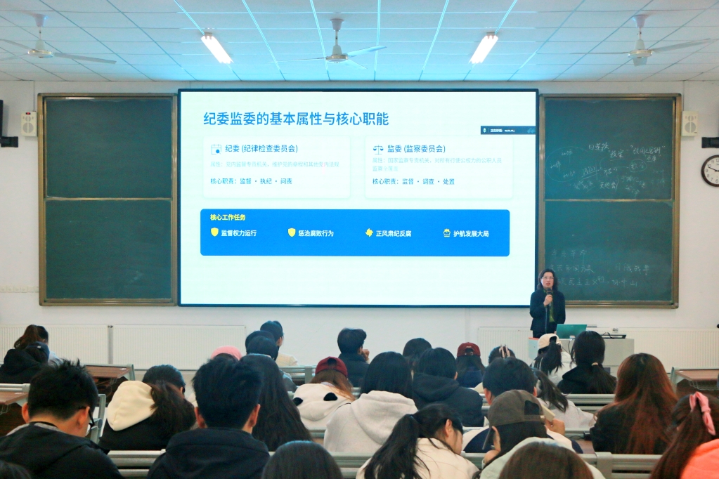 滕鲁慧以“廉洁修身 清正做人——扣好人生第一粒扣子”为主题,从“读懂廉洁政治的深刻内涵”“认清当前反腐败斗争形势”“坚守清正廉洁初心做新时代合格学生干部”三个方面为同学们作了详细讲解。鼓励青年学生干部要坚定不移跟党走,自觉提升廉洁思想高度,扣好人生第一粒扣子,不断增强“崇廉拒腐”的自我认知,时刻以廉洁自律为准则审视自身行为,推进廉洁思想与实际行动相统一。