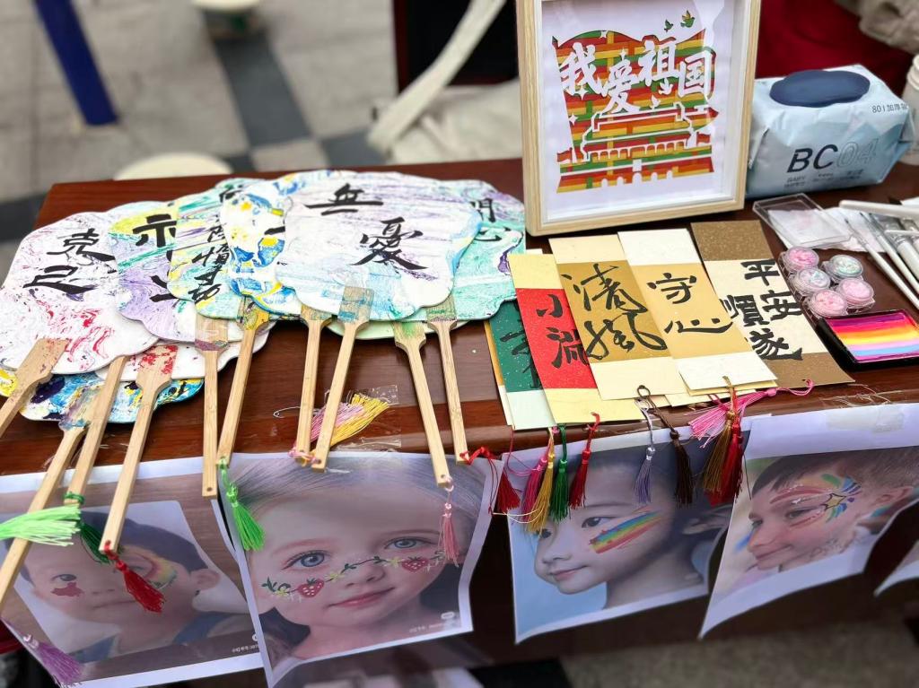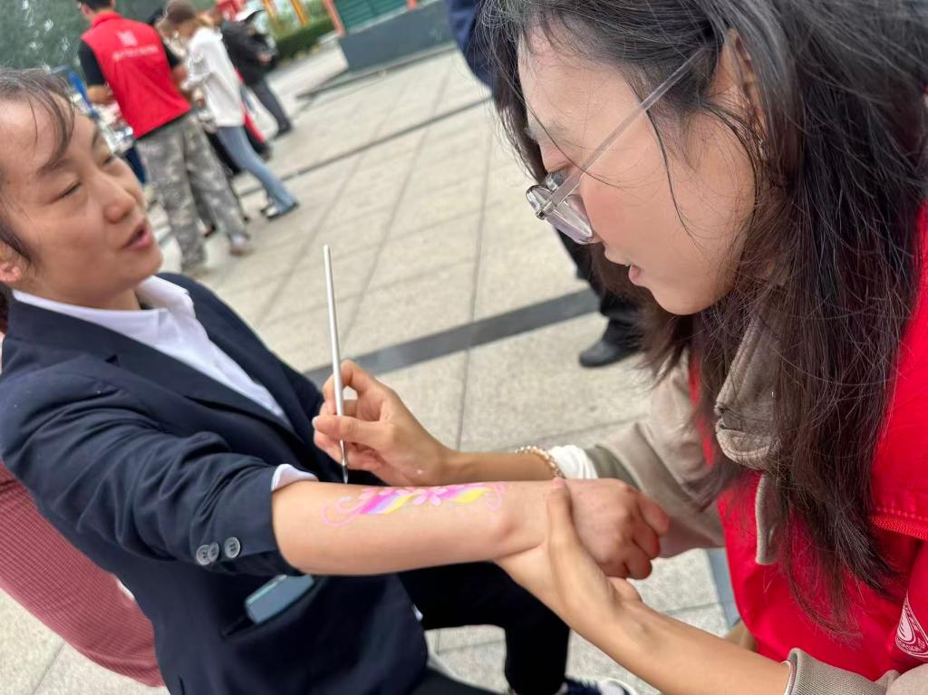 美术与艺术设计学院依托社区创意集市,充分发挥美术与书法专业能写会画的特长,展示了立体纸艺、非遗剪纸、非遗漆扇、水彩画、植物书法文创、竹编画等原创手工作品50件,各类作品兼具艺术性与文化韵味,引得居民驻足观赏。同时,结合中秋、国庆双节将至的节日氛围,为社区群众进行面部和手臂彩绘活动,根据面部特征,用植物颜料,为每个居民和孩子绘制了独一无二的彩绘造型。孩子们看着镜中精致的图案,脸上满是欢喜,纷纷拉着家长拍照留念。此外,现场书写节日祝福书签赠予社区居民,进一步弘扬了中华优秀传统文化,活动现场欢声笑语不断,节日氛围与艺术气息交融。